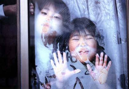 おばあちゃんが、お孫さんのあどけない表情をとらえた作品です。窓に顔をくっつけるのは、誰でも子供時代に経験のあることですね。窓に描いた絵は消えてしまっても、想い出は写真に残ります。